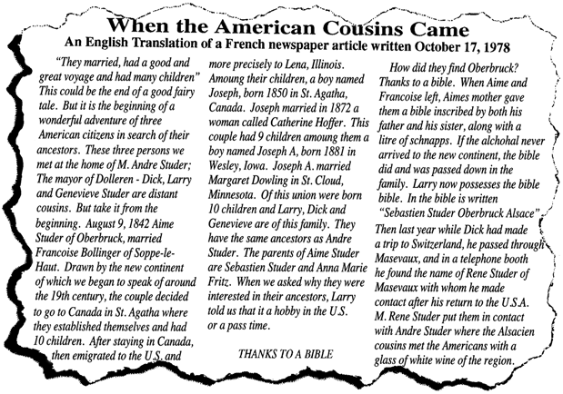 Translation as follows: The Americans astonish us always. Now they have as their hobby the search of their ancestors and if finances permit, they travel to the country their ancestors left in search of a new world. We met three of these persons, very friendly, who spoke of their ancestry. Genevieve, Dick and Larry Studer of Minnesota, U.S. were the guests of M. Andre Studer, Mayor of Dolleren and 6th cousin; they spoke of their common ancestor, Antoine Studer 1733-1841, of Oberbruck.